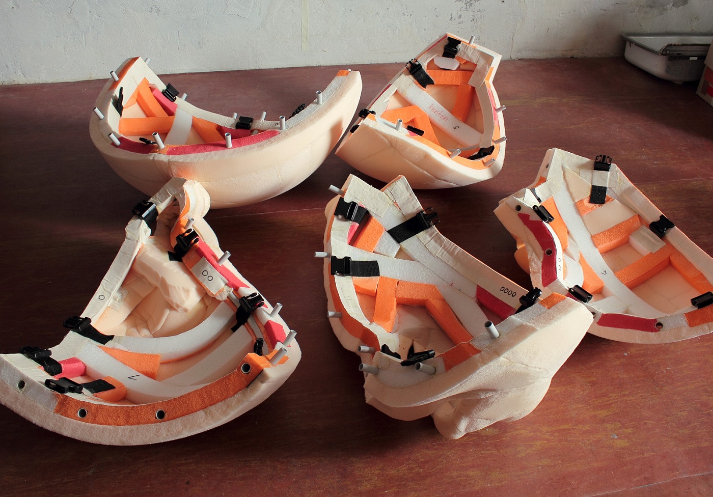 Material: verschiedene Schaumstoffe, Gurtband, Schnallen, PVC-Rohre, Stoff u.a.